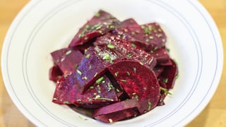 Kochwasser mit Salz und etwas Kümmel würzen und die Rote Bete darin etwa 30 bis 40 Minuten garen. Ersatzweise kann man auch vorgegarte Ware aus dem Supermarkt verwenden. Die Rote Bete auskühlen lassen, dann schälen und... mehr