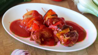Fleisch, Speck, Zwiebeln, Pilze und Gemüse säubern, in gleich große Stücke schneiden und abwechselnd auf Spieße stecken. Mit Salz, Pfeffer, Paprikapulver, etwas Zucker und Kurkuma würzen und etwas Olivenöl bestreichen. Eine Grillpfanne erhitzen und... mehr