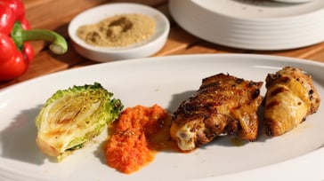 Die Hähnchenkeulen an den Gelenken in Ober- und Unterkeulen teilen. Den Saft und die abgeriebene Schale von ½ Orange mit Currypulver, Fenchelsaat, Honig, Crema di Balsamico und Öl in eine Schüssel geben. Knoblauch schälen, pressen und mit etwas Salz, Pfeffer und... mehr